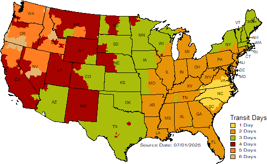 This map displays the current, estimated transit times for UPS origination at our address in southeast North Carolina (the red dot on the map).